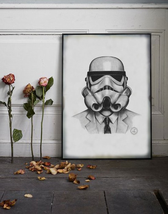 An original drawing of our Collection LPMK that will delight all the geeks, indeed we revisit again the cult saga Star Wars with a portrait full of sharpness of a Stormtrooper in 3 pieces suit. This soldier of the Empire that marked our imagination and our childhood.