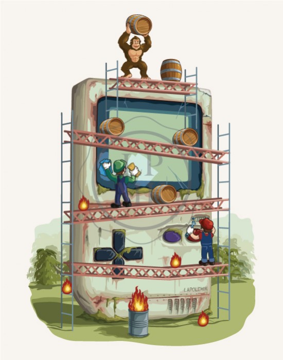 C'est ça, la nostalgie selon Lapolemik : pas la tristesse d'un passé révolu, mais l'entêtement doux de ceux qui refusent que certaines choses disparaissent pour de bon. Cette affiche fine art met en scène une console rétro des années 80 abandonnée dans l'herbe, ses murs fissurés, son écran éteint — et sur l'échafaudage, deux petits héros de l'enfance pixelisée qui grimpent, réparent, rendent la lumière. En haut, la colère gronde. Les barils roulent. Les flammes crépitent. Ils continuent quand même. Pop culture, gaming rétro, culture japonaise des années 80 — une pièce graphique et culte pour ceux qui savent. Imprimée dans notre atelier de Saint-Malo sur papier fine art texturé 230g, encres pigmentaires longue durée. Formats A4, A3 et B2. Livrée roulée dans un tube de protection. Édition limitée.