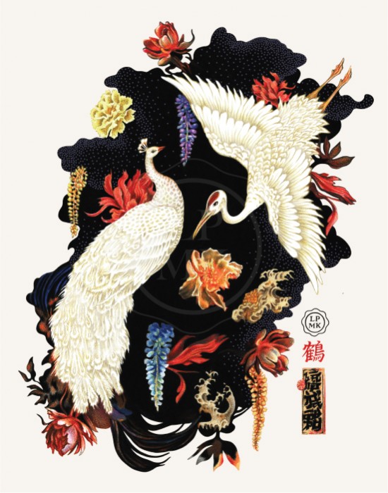 Illustration : deux grues blanches stylisées, semblant peintes au pinceau, tournoient sur un nuage d’encre noire. Plumes détaillées et explosions florales rouges, bleues et dorées sur fond clair. Signé Lapolemik.